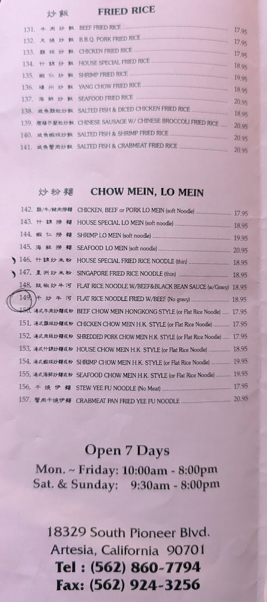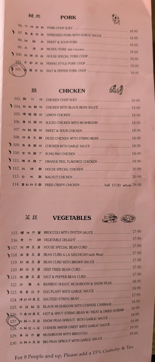 Pork and Chicken Entrées: Several pork dishes such as sweet & sour pork and house special pork chop are listed alongside chicken options like lemon chicken, kung pao chicken, orange peel flavored chicken, and chicken with black bean sauce. These are suitable for more substantial meals, typically served at lunch or dinner.