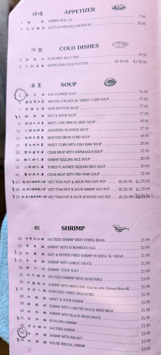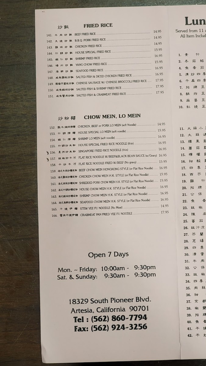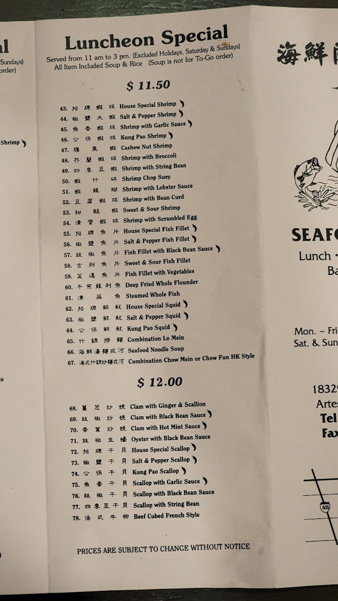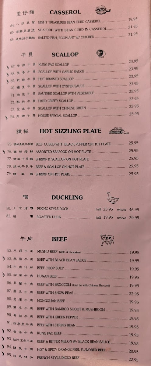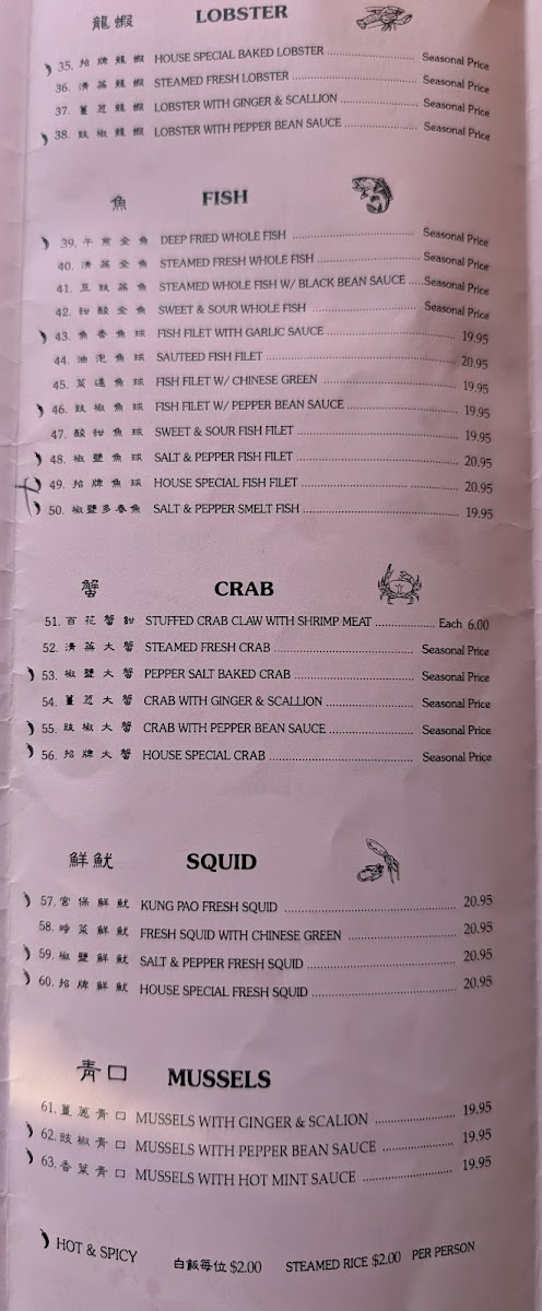 Seafood Dishes: A variety of seafood options are available, including calamari, seafood chow mein, seafood with pan-fried noodles, and multiple shrimp dishes prepared with different sauces (garlic, black bean, kung pao). Fish fillets are also offered with various preparation styles.
