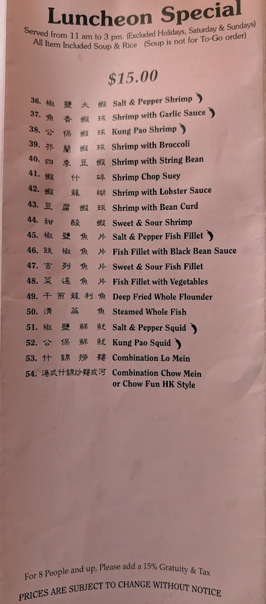 Luncheon Specials: This category highlights shrimp-focused dishes and fish fillet options, designed for midday dining. Dishes include salt & pepper shrimp, cashew nut shrimp, shrimp with broccoli, and fish fillet with black bean sauce.